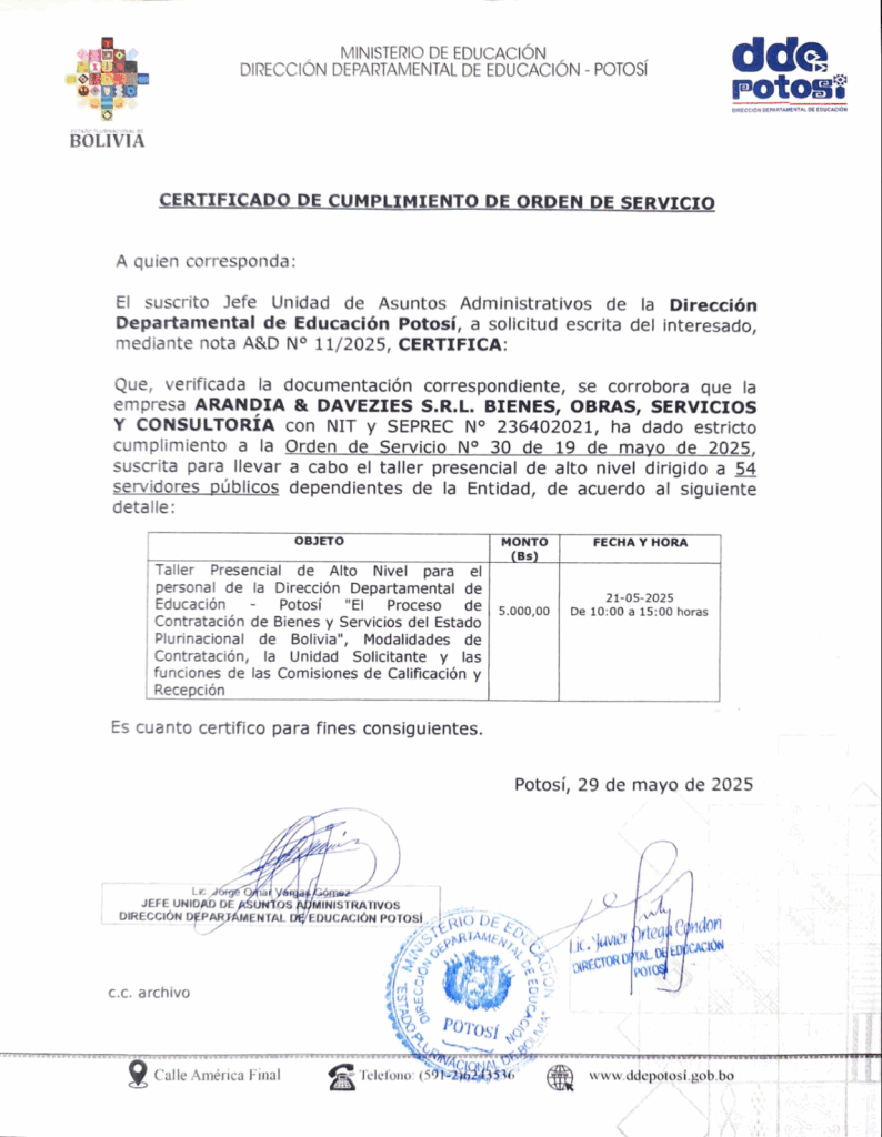 En fecha 21 de mayo de 2025, en la ciudad de Potosí se llevó a cabo con mucho éxito el taller presencial de alto nivel “El proceso de contratación de bienes y servicios del Estado Plurinacional de Bolivia: Modalidades de contratación, la unidad solicitante y las funciones de las Comisiones de Calificación y Recepción”. Evento impartido a 54 servidores públicos de la Dirección Departamental de Educación de Potosí y contó con la presencia del Director, Subdirector y personal técnico de esta Entidad Pública.
