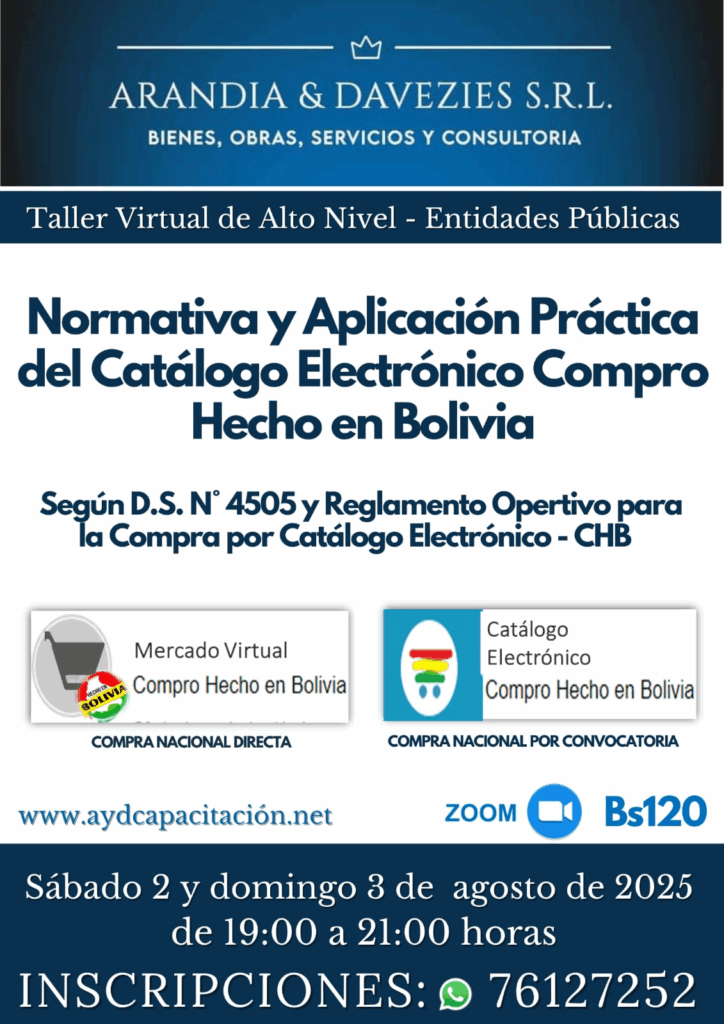 / Noticias / Por Alvaro Arandia / Noticias / Por Alvaro Arandia Del 12 al 13 de agosto de 2024 a través de la plataforma Zoom, se llevó adelante con mucho éxito el Taller Virtual de Alto Nivel: “Normativa, aplicación y Operación del Catálogo Electrónico y Mercado Virtual Compro Hecho en Bolivia″, impartido a 35 servidores públicos de la Oficina Departamental