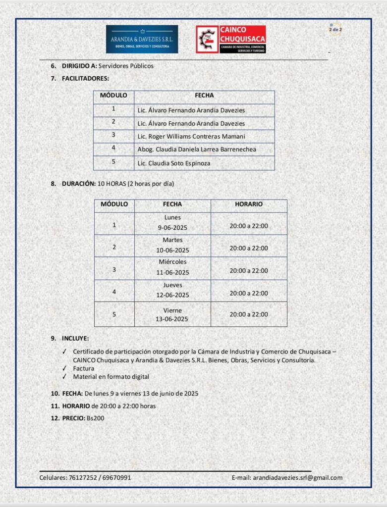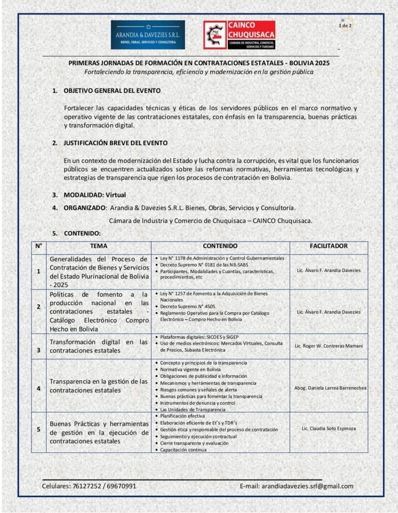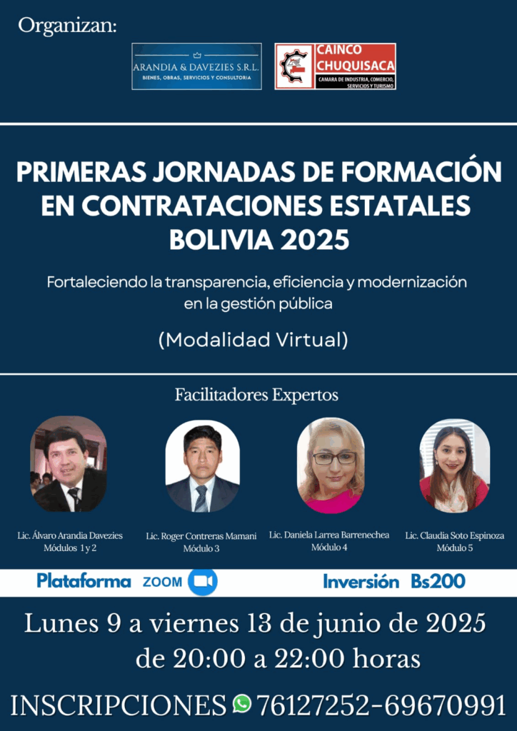 Nuestra empresa ARANDIA & DAVEZIES S.R.L. BIENES, OBRAS, SERVICIOS Y CONSULTORÍA junto a la CÁMARA DE INDUSTRIA Y COMERCIO DE CHUQUISACA, llevamos adelante las “PRIMERAS JORNADAS DE FORMACIÓN EN CONTRATACIONES ESTATALES – BOLIVIA 2025”, con la inscripción de 50 servidores públicos de todo el país. El evento se llevó a cabo de manera virtual del lunes 9 al viernes 13 de junio de 2025 y contó con la participación de 4 facilitadores de amplia trayectoria, conocimiento y experiencia.