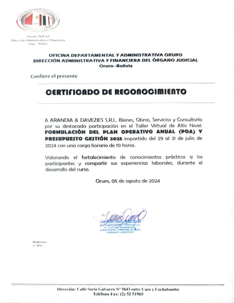 Del 29 al 31 de julio de 2024 a través de la plataforma Zoom, se llevó adelante con mucho éxito el Taller Virtual de Alto Nivel: “Formulación del Plan Anual Operativo (POA) y presupuesto gestión 2025″, impartido a 35 servidores públicos de la Oficina Departamental Administrativa Financiera del Órgano Judicial de Oruro.